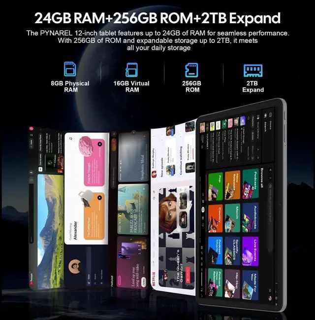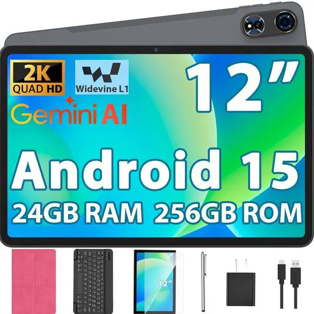 2026 12 Inch Tablet + Widevine L1The android tablet features a 12-inch 20001200 HD touchscreen, delivering an immersive experience with crisp visuals and vibrant colors. Certified with Widevine L1, tablets fully support 1080P HD content playback on platforms like Netflix and YouTube. Paired with stereo dual speakers, tablet makes watching shows and movies feel like you're right there in the moment ^^ 24GB RAM + 256GB ROM + 2TB ExpandEquipped with 24GB RAM (8GB physical + 16GB virtual) and 256GB ROM, the android tablet with keyboard can handle multitasking smoothly with no lag, while storing more files, photos, videos, music, and more.