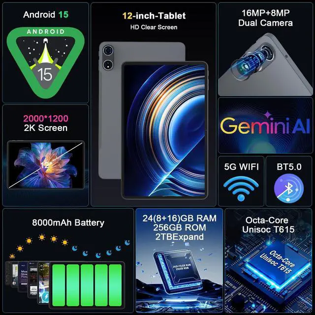• Newest Android 15 Tablet with Octa-core CPU12" tablets run 2026 latest Android 15 operating system, featuring optimized personalization, privacy protection, and permission management. Functions like facial recognition, sp