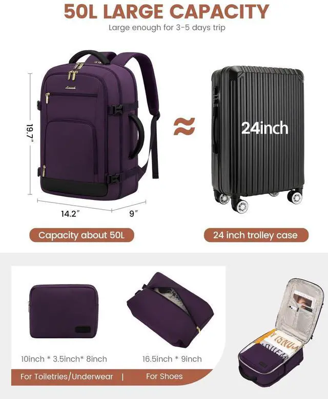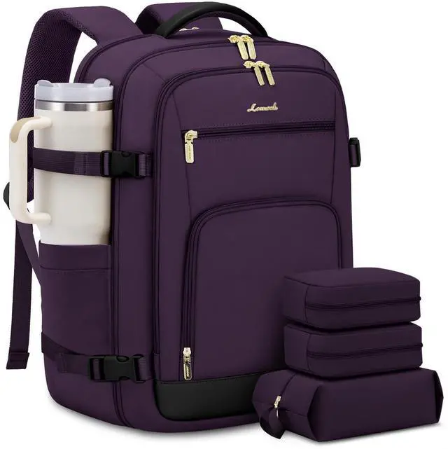 DescriptionLOVEVOOK Large Travel Backpack for Women & Men, 40L Carry on Backpack for Airplanes, TSA Personal Item Travel Bag fits 17" Laptop, Waterproof Travel Essentials Airline Approved with 2 Packing Cubes
