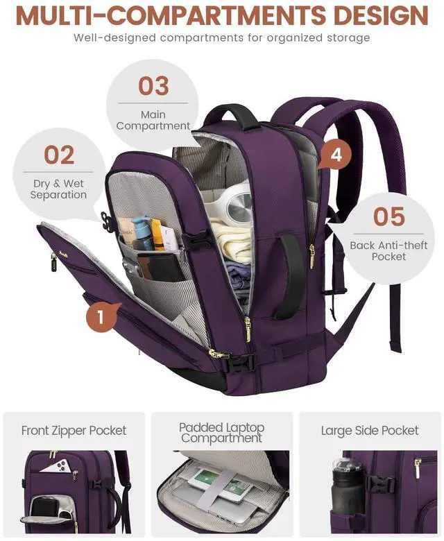 Large Capacity With Great Organization : This travel backpack boasts a generous 50L capacity, perfect for 3-5 days of travel essentials. 3 Big compartments and 18 pockets, ensuring everything is neatly organized. A dedicated and padded compartment fits a 18 inch laptop for maximum safety. The elastic band water bottle pocket securely holds a 500ml bottle. This versatile construction design makes this backpack perfect for travel, business trips, weekend getaways, and everyday use.