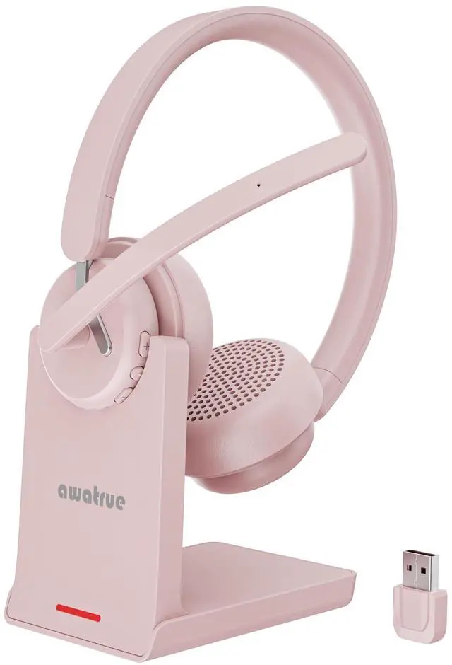 awatrue Wireless Headset with Mic, Bluetooth Headset with AI Noise Cancelling Microphone & Charging Base, 2.4GHz Wireless Headphones with USB Dongle for Computer/Remote Work/Call Center/ZoomPink