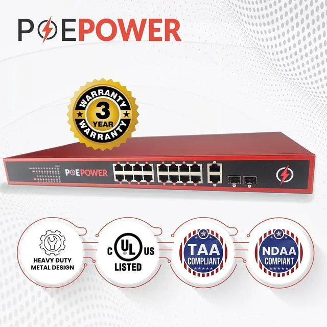 Intelligent power allocation ensures every connected device receives exactly what it needs. The switch is fully compatible with 802.3 af, 802.3 at, and 802.3 bt standards, so both high demand and lower power devices are powered safely and efficiently without risk of being overpowered. Equipped with sixteen gigabit POE ports and four additional uplink ports, including two Ethernet and two SFP, it provides excellent versatility for connecting routers, other switches, or fiber links. This makes it well suited for professional installations where reliability and performance are critical. Housed in a durable metal enclosure, UL Listed, and TAA Compliant, the switch is built for long term use.