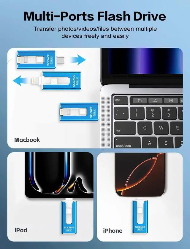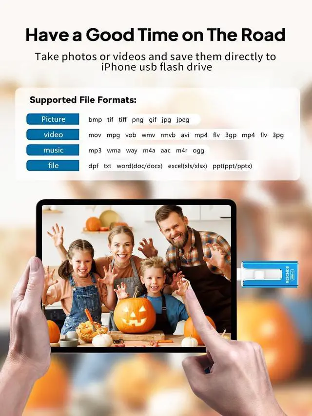 For Android smartphones: Need to open OTG function) ^^ Plug and Play, No Application Required, Instantly Increases iPhone and iPad Memory SpaceIf you almost used up all space on your iPhone or iPad, this photo stick for iPhone helps to expand your memory at full storage with 512GB. And usb memory stick for photos is also a great partner for traveling photographers editing on iPad. Using this memory device for your iPhone, iPad or Computers, no worries with the iPhone storage anymore! ^^ Watch Movies, Photos and Play Music Directly From Phone Flash DriveStore your favorite videos, audios and music on your iPhone's Photo Stick, then seamlessly plug and play on your iPhone or iPad anytime, anywhere. No more need for Internet or WiFi. This iPhone storage device plays videos in many different formats. Pictures stored on the Phone storage device also support different formats. Great way to store all your pictures and videos on an phone external storage device. ^^ High Transfer SpeedTransfer photos, videos, and files in seconds with our USB stick. With a write speed of up to 20 MB/s and a read speed of up to 30 MB/s, our flash drive for iphone have higher performance than conventional usb storage flash drive.