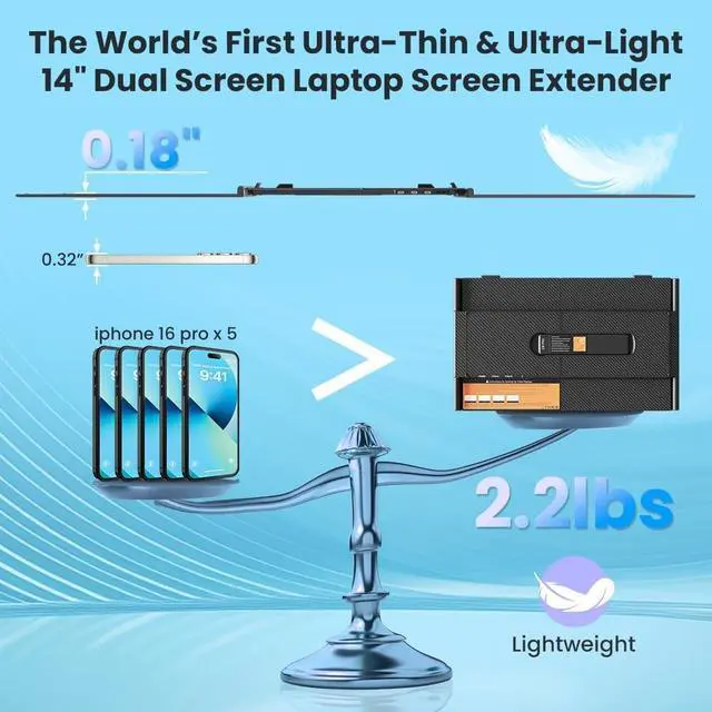 S8 Pro Laptop Screen Extender-Worlds First 1KG Ultra-Light Dual Screen The S8 Pro redefines portability as the lightest 14-inch dual-screen portable monitor (1kg) with an ultra-slim 4.5 mm thin panel and aerospace-grade aluminum body. Slip it into your bag and boost your workspace anywhereperfect for professionals, students, and digital nomads ^^ Stunning 14" FHD 1080P IPS Display with Ergonomic Flexibility Enjoy vibrant, sharp visuals on a 14-inch FHD (19201080) IPS screen with 60Hz refresh rate and 300 cd/m brightness. The 0-180 screen tilt + 0-90 stand adjustment ensures the perfect angle for work, movies, or gaming ^^