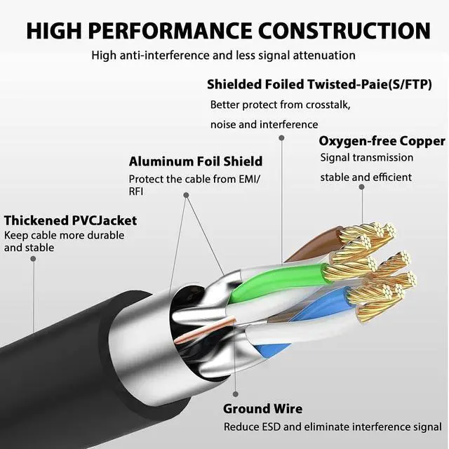 Quality & Stability: 26AWG Oxygen-free pure copper conductors provide this cable with superior and stable speed; The 4 twisted pairs bare copper wires are encased with aluminium foil shield and woven mesh shield; A multi-protection mechanism hugely improves interference elimination and crosstalk noise.