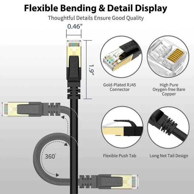 Amazing Transfer Speed: HiiPeak CAT8 Ethernet patch cable is designed for use of 40 Gigabit high-speed Ethernet, providing the fastest performance of up to 2000MHz and speeds of up to 40Gbps. Double-shield (S/FTP) to avoid interference and data losses, maximum the network speeds to download, online 4K 8K video streaming, E-sports gaming, data centres, and other data at high speed without worrying about slow network Speed. ^^