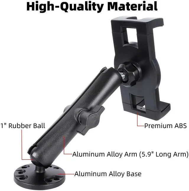 Premium Durable Construction: Features an aluminum drill base, aluminum alloy long arm, and ABS tablet clip with anti-slip rubber. The double socket arm locks your device at any angle, while shock-absorbing 1" rubber balls ensure a rock-solid grip even on rough terrain.