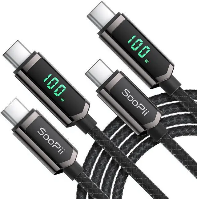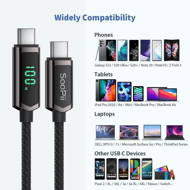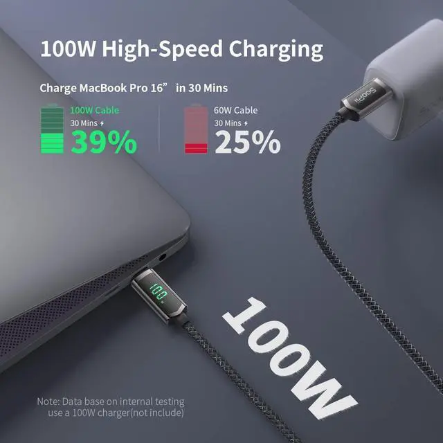 Smart LED Display Real-time charging power visible, show charging status and signify high power process. Built-in smart chips monitoring the charging power and adjusting current and voltage automatically, avoiding damage to the battery in case of unstable current. (Please note display module just show charging power, it neither increase nor decrease charging current) ^^ 100W High-Speed ChargingSupports up to 100W (20V 5A) charging speed, with a max output of 100W charger, SooPii USB C to USB C cable can charge any Type-C devices from phones to laptops. Pair with a 100W USB-C Power Delivery charger to power up a MacBook Pro 16 in 2 hours.