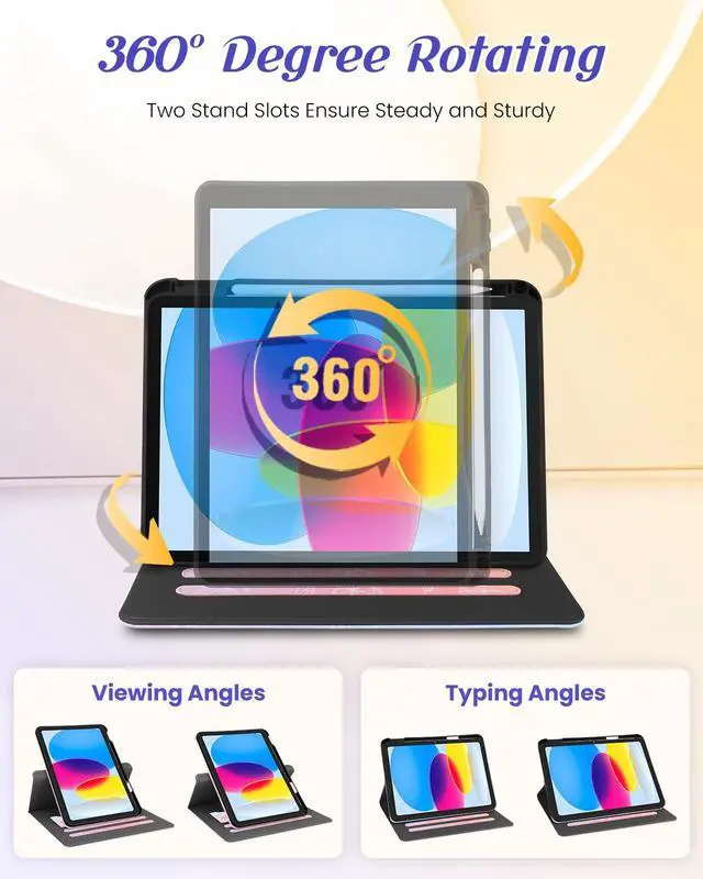 Rotating Stand: This for iPad cover 10th/11th generation with an functional rotating stand design, supporting your devices to switch between landscape and portrait orientations. While 2 anti-slip strip design allow for multiple horizontal stand angles for comfortable viewing or typing ^^
