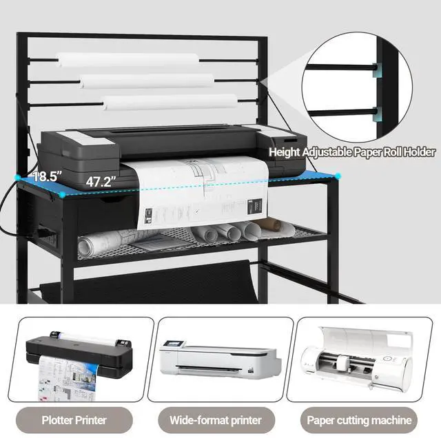 Heavy-Duty & Sturdy ConstructionThis large printer workbench is built with a high-quality wooden top and reinforced steel tubes for exceptional durability. while diagonal stabilizing bars on both sides ensure rock-solid stability to securely hold wide-format printers, plotters, and large printing equipment. ^^ All-in-one Storage SolutionBased on real usage environment, this wide format printer workstation provides versatile organization: an adjustable paper roll holder on top, an accessory storage drawer underneath, height-adjustable shelves for printed drawings, and a pull-out fabric pouch for immediate print collection. ^^ Multi-Functional Work PlatformWith a spacious 47.2" x 18.5" desktop, this heavy-duty tech table accommodates wide-format printers, CAD plotters, and cutting machines simultaneously, creating an efficient production station for professional workflows. ^^ Built-in Power OutletThis professional drafting plotter workstation, designed with 3 AC outlets + USB charging port+ Type C port and extended 5ft power cord for flexible positioning of plotters, large format printers and auxiliary devices from any workspace location. ^^ Industrial-Grade Lockable WheelsEquipped with 4 industrial 360 smooth-rolling lockable casters, This commercial wide format printer stand allows effortless repositioning of fully-loaded equipment, while maintaining stability during printing jobs.