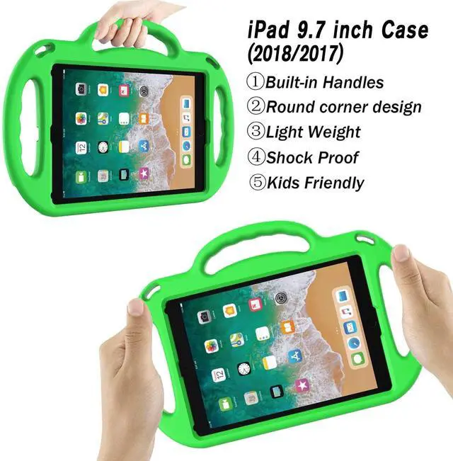 A1475 A1476)Features: Durable lightweight shockproof case specially designed for iPad 9.7 2018/ 2017Snug-fitting case with built-in stand allows hands-free viewing enetertainmentDetachable Shoulder Strap, put it at the back of a car headrest, available on the goiPad 9.7 Case with Precise Openings gives easy access to buttons, ports, camerasiPad 9.7 -inch case comes in a series of enjoyable bright & fun colors, great for both kids & adultsPackage