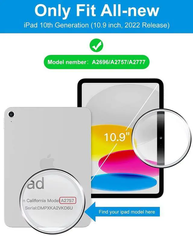 Generation 2022 10.9 inchModel: A2696/A2757/A2777). It is Not compatible with any other devices. Please check back bottom of your iPad to find the model number. ^^ Multiple Viewing and Pencil Holder Keyboard Case-the keyboard is magnetically attached and very versatile and the thoughtful design easily adjusts to whatever comfortable angle suits you best. That makes the IPad work like a laptop, so it's perfect for working, typing and editing or watching videos. It has a pen slot inside to prevent the apple pencil from being lost, grab your Apple Pencil, Pencil Cap and Adapter effortlessly whenever you want, easily to carry your with your device. ^^ Magnetic Detachable Keyboard & Long Life Battery The magnetic for iPad keyboard and case are separated, magnetically attached, the keyboard can be removed from the case. If you don't need it, you can remove the keyboard. Bluetooth connection is easy to operate. Keyboard for iPad 11th/10th gen built-in premium Li-ion battery with energy-saving, 2.5 -3 hours full charge, work for at least 70 hours, stand by for 90 days. no need to replace the battery. ^^ Auto Sleep/Wake & Full Body ProtectionIt automatically wakes or puts your iPad to sleep when it is opened or closed, save much power for your iPad.