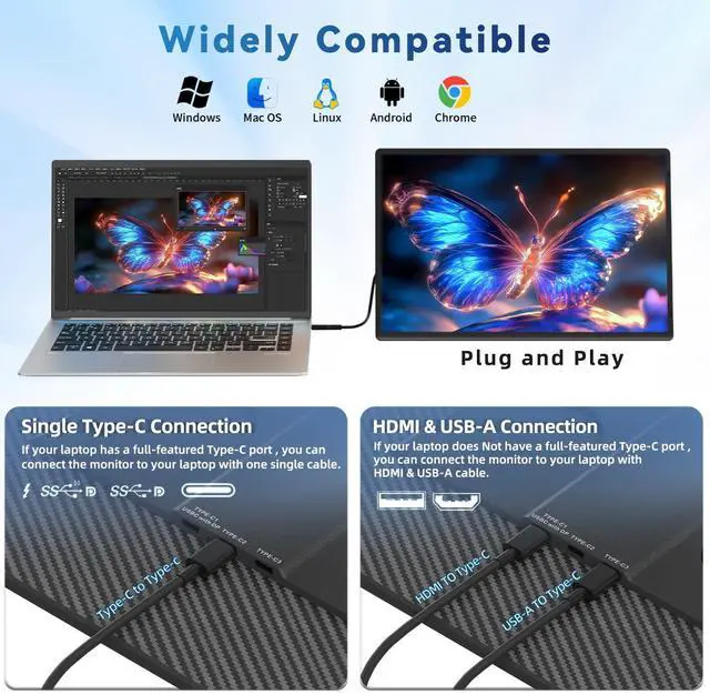 Plug & Play Convenience: No drivers needed! This monitor portable works instantly via USB-C/HDMI, making it a seamless portable monitor for laptop, PC, or gaming consoles. 1 full featured USB-C port or 1 HDMI port is needed. For full featured USB-C, 1 USB-C to USB-C cable connect to TYPE-C2/C3 port to use; For HDMI port (2 cables needed), HDMI to USB-C cable connect laptop HDMI port to TYPE-C1 with DP port for signal, and another cable connect laptop to TYPE-C2/C3 port for power to use ^^