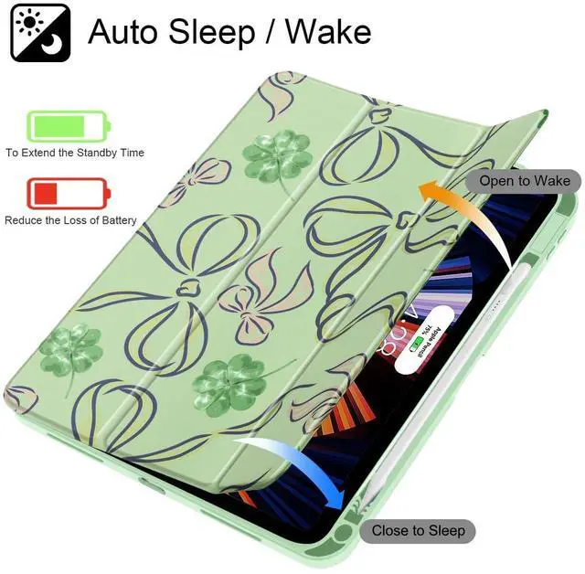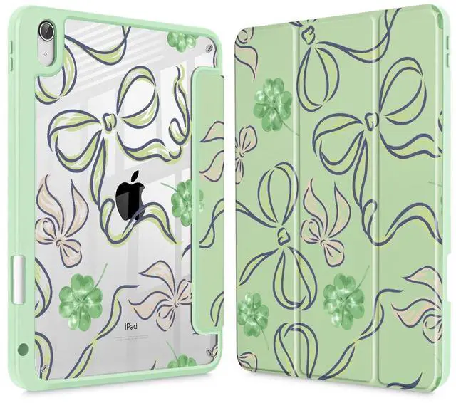 ICEKEE Case for iPad (A16) 11th Gen 11 Inch 2025, iPad 10th Gen 10.9 inch 2022 with Pencil Holder, Slim Printed Stand Protective Cover with Hard PC Translucent Back Shell Cover, Clover Bows
