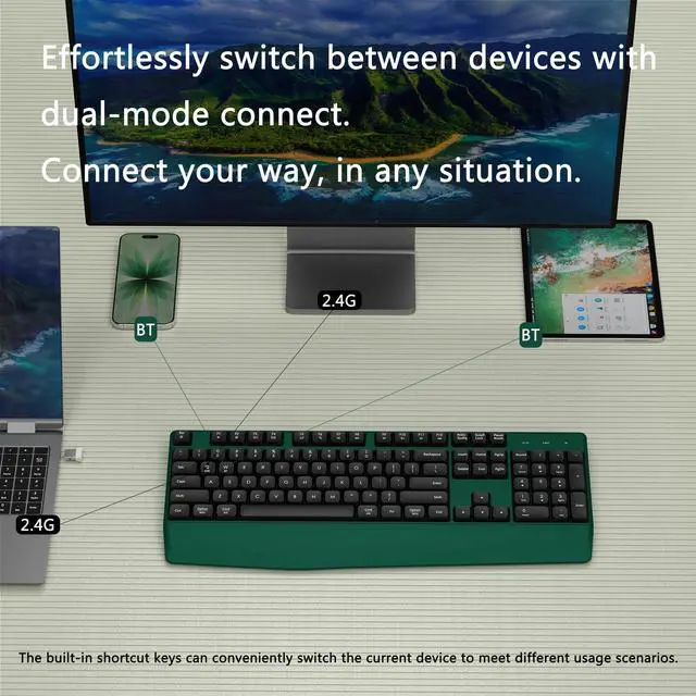 • Bluetooth & USB Dual-Mode Wireless Keyboard: Upgrade your workspace with this sleek, minimalist Bluetooth & USB dual-mode keyboard. Designed to blend seamlessly into any office or home environment, it exudes a clean and professional aesthetic. Perfect for those who value both style and functionality.