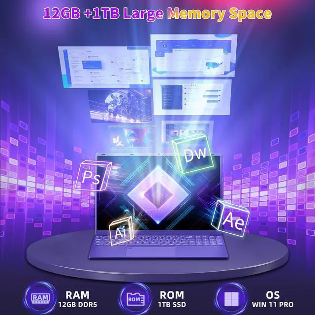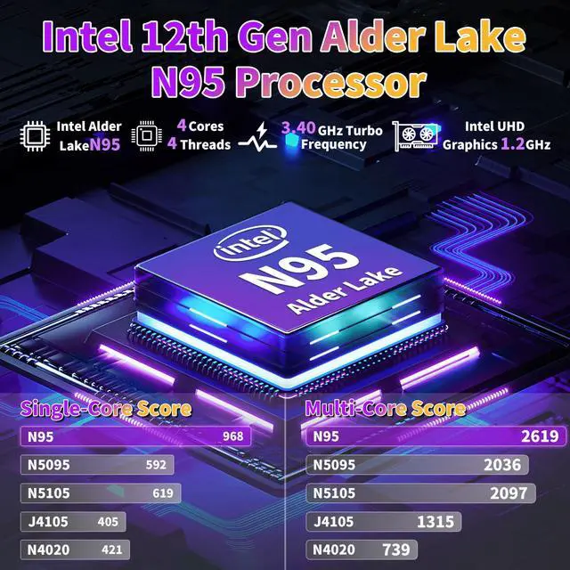 Alder Lake N95 Processor12th-gen Alder Lake N95 CPU (4C4T, up to 3.4GH z), with powerful multi-core design, performance is much higher than Pentium N5030 and Celeron N5095. Advanced manufacturing process technology and UHD Graphics 1.2GH z, which is critical for applications such as graphic design and video editing. ^^ 12GB RAM Storage Space12GB 4800MHz LPDDR5 memory with optional configurations -256GB/512GB/1TB M. 2 NVMe SSD, meeting the needs of users who want to store large amounts of data, applications and media files. Micro SD card support up to 512GB. You'll have plenty of space to handle all kinds of computing tasks with ease.