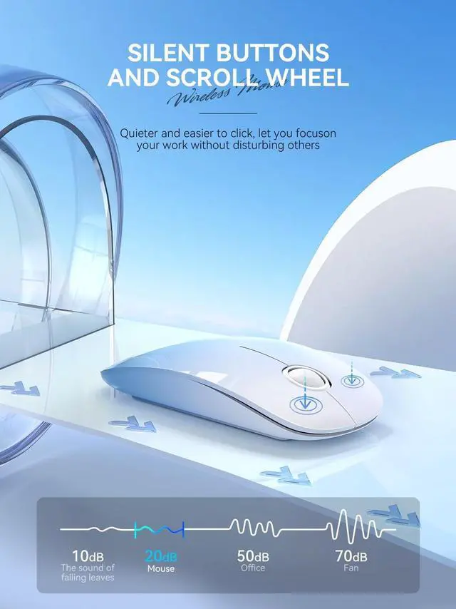 Scrolling: Experience a nearly silent operation with over 90% noise reduction on clicks. Even the wide rubber scroll wheel moves quietly, allowing you to work without disturbing othersperfect for home or office use. ^^ Dual Connectivity (BT 5.1 + 2.4G ): Connect your way with Bluetooth wireless technology or the included USB receiver. Control two devices with just one mouseswitch between them seamlessly with a single click. Perfect for moving between your desktop, laptop, tablet, or MacBook.