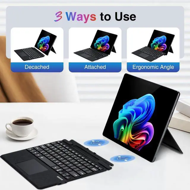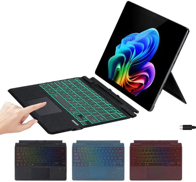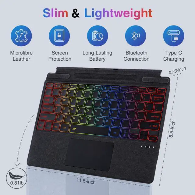 Typc-C Charging: Connect your Surface Pro tablet via wireless Bluetooth, it can be typed normally even after detached. It can be fully charged in about 2h by Type-C charging cable, support charging and using at the same time, without consuming your tablet power. ^^ Slim & Lightweight & Microfiber Leather: Using microfiber fabric similar to the original keyboard, it is thin, lightweight, scratch-resistant, wear-resistant, does not leave fingerprints, feels comfortable, and protects the screen. The keyboard weighs only 0.81 lbs, making it easy to carry without any burden. ^^ 7-Color Backlight and Long Lasting