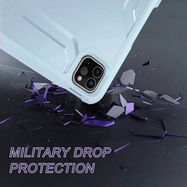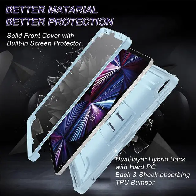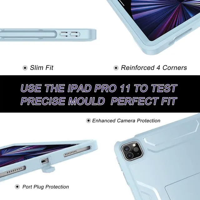 Compatibility Exclusively designed for iPad Pro 11 inch 4th Generation 2022, 3rd Generation 2021, 2nd Generation 2020 and 1st Generation 2018, iPad Air 5th Gen 2022, iPad Air 4th Gen 2020, Please find the iPad model before purchase ^^ Full Body Protection Dual layer case with PC hard shell and flexible TPU lining provides protection against accidental drops, bumps and impact to your iPad ^^ Built-in Screen Protector Built-in screen protector prevents scratches without compromising sensitivityproviding full protection for your new iPad pro 11 ^^ Wireless Charging/Pencil Holder Built-in pencil holder supports Apple pencil (2nd Gen) wireless charging and magnetic attachment.