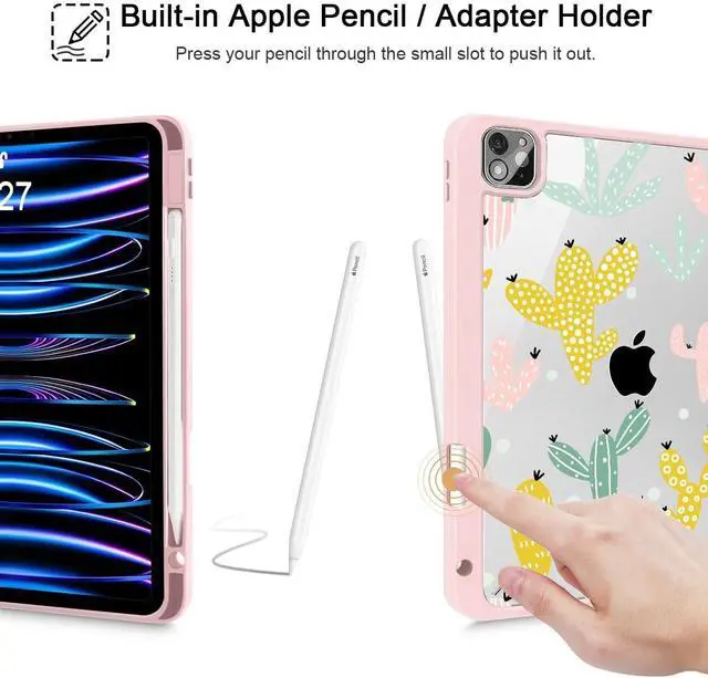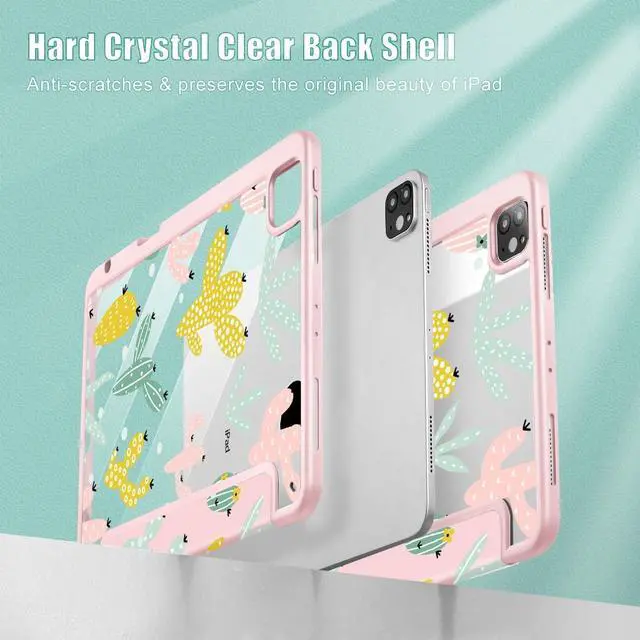 Lepeoac Case for iPad Pro 11 inch (4th, 3rd, 2nd & 1st Gen) 2022 2021 2020 2018, Buit in Pencil Holder with Shockproof Cover Clear Shell + Auto Wake/Sleep,Cute Cacti-Pink