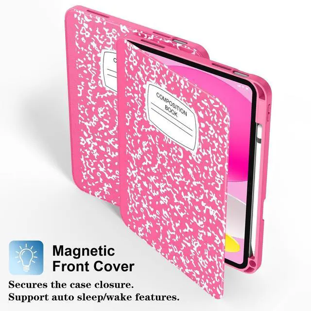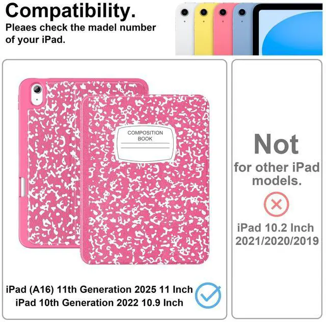 ModelsComposition notebook iPad case designed for new iPad (A16) 11th generation 11 inch/10th generation 10.9 inch released in 2025/2022. Not compatible with other iPad models(ipad 10.2 9th/8th/7th Gen) ^^ MaterialMade of flexible silicone back & TPU cover, iPad (A16) 2025/2022 case provides full protection against shocking & scratching for your new iPad 11th/10th generation 2025/2022 ^^ Multi anglesAnti-slip front stand shell (Not trifold) creates different angles for viewing or typing; magnet secures the iPad 11th/10th generation case closure, easy to snap on and off ^^ FunctionBuilt-in pencil holder makes iPad 11th/10th generation 2025/2022 case convenient to carry and better protect your Pencil.
