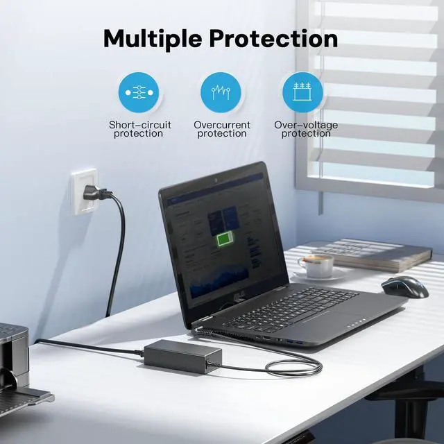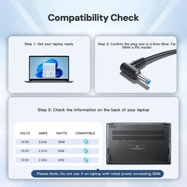 The Dongerdi 65W Laptop Charger delivers up to 65W ( 19.5V 3.33A ) of fast, stable power to keep your HP laptop performing at its best. Designed for wide compatibility, it fits HP Model 15, Pavilion 15/17, and select models with a 4.5 x 3.0 mm blue tip connector, supporting 65W/45W adapters such as 710412-001 and L25296-002/004. Ideal for travel, it supports 100240V global voltage input and includes an extended 10-foot charging reach with a 6-foot adapter cable and 4-foot power cord. The compact, lightweight design offers portability and safety with built-in protection against overcurrent, overvoltage, and short circuits.