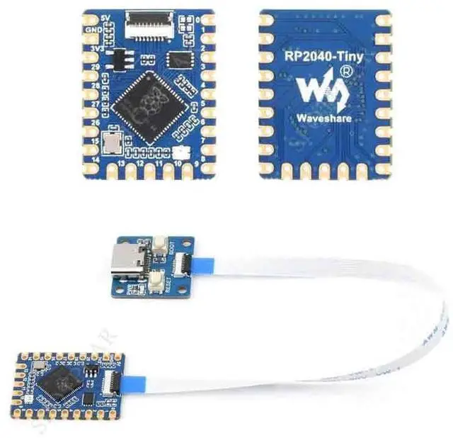 --------OverviewRP2040-Tiny Development Board, Raspberry Pi Microcontroller Development Board, Based On Official RP2040 Dual Core Processor, USB Port Adapter Board Optional--------FeaturesRP2040 microcontroller chip designed by Raspberry Pi in the United KingdomDual-core Arm Cortex M0+ processor, flexible clock running up to 133 MHz264KB of SRAM, and 2MB of onboard Flash memoryOnboard FPC 8PIN connector, adapting USB Type-C port via adapter boardCastellated module allows soldering direct to carrier boardsUSB 1.1 with device and host supportLow-power sleep and dormant modesDrag-and-drop programming using mass storage over USB20 multi-function GPIO pins2 SPI, 2 I2C, 2 UART, 4 12-bit ADC, 16 controllable PWM channelsAccurate clock and timer on-chipTemperature sensorAccelerated floating-point libraries on-chip8 Programmable I/O (PIO) state machines for custom peripheral support--------Support C/C++, MicroPython, ArduinoComprehensive SDK, Dev Resources, Tutorials To Help You Easily Get Started--------Compact Size, Separate Adapter Board DesignCastellated Holes With Immersion Gold Design, Highly Integrated Packaging, Easy To Embed Into Various Product Applications Adapting USB Type-C Port Via Adapter Board--------Dual-Core Arm ProcessorDual-Core Arm Cortex M0+ Processor, Flexible Clock Running Up To 133 MHz--------20 Multi-Function GPIO PinsConfigurable Pin Function, Allows Flexible Development And Integration* Reserved two 0402 resistor pads for user mode selection, you need solder the corresponding resistors or short the pads and complete the corresponding programming.