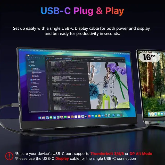 (NOTE: your devices USB-C port must support Thunderbolt 3/4/5 or DP Alt Mode. ) ^^ Kickstand & VESA Mountable Whether using the adjustable kickstand for travel or attaching to a VESA mount at home or office, this portable monitor adapts to any setup.