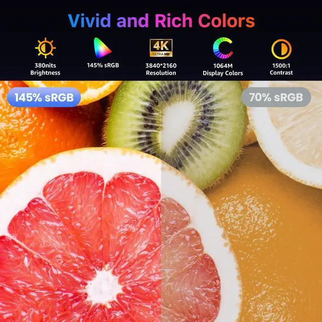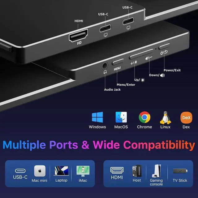 Sharp 4K Portable Monitor Experience ultra-sharp visuals on this 15.6 4K monitor. Enjoy vivid colors with 145% sRGB coverage and bright, clear images at 380 nits, perfect for work, entertainment, and creative projects. ^^ Lightweight & Travel-Friendly Only 1.5 lb, this slim 15.6 monitor easily fits into your backpack or laptop bag, perfect for remote work and travel. ^^ Wide Device Compatibility Equipped with one HDMI port and dual USB-C ports, this 15.6 portable monitor compatible with laptops, PC, and gaming consoles like Xbox and PS4/PS5, making it perfect for both productivity and entertainment.