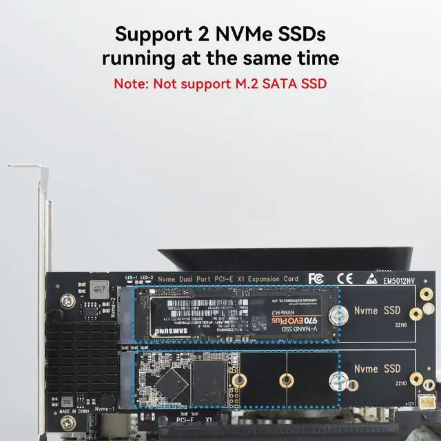 *Note: Not support M. 2 SATA SSD. ^^ Safe & StableThe solid capacitor for voltage adjustment can avoid current wave in case of SSD damage. The NVME PCIE card powers from PCI-E port for 2 NVMe SSDs for more stable operation. No external power adapter required. ^^ Effective Heat DissipationCopper strips and multi-hole cooling design can lower the temperature produced by the SSD during operation. The 2 included heatsinks prevent the drive from getting too hot. The NVMe PCIe adapter will stabilize SSD performance and extend the usage life of the hard disk. ^^ OS CompatibilityCompatible with a wide range of application systems including Windows 11/10/8/7/Linux/Mac OS. Plug and play, no driver required. The new M. 2 NVMe SSD needs to be initialized and formatted before it can be recognized by the computer host.