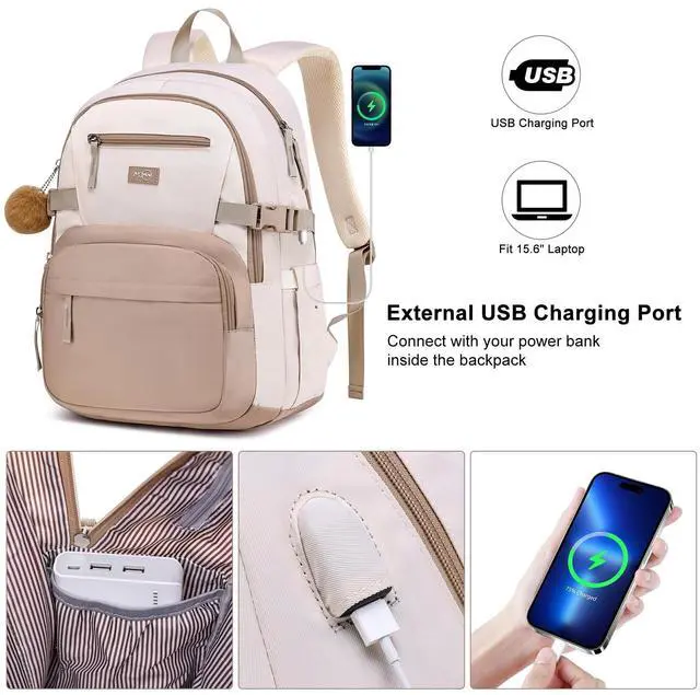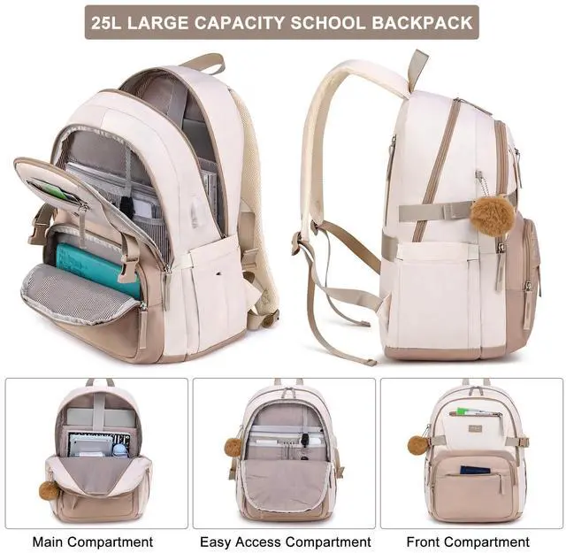 Multi-Compartment Design The backpack for school features 4 compartments: a padded laptop sleeve (fits 16.1" laptop & 12.9" iPad), a main compartment, and 2 front pockets. Plus, 2 side water bottle holders for easy access. ^^ Spacious & Lightweight This school backpack measures 11.8" x 7.5" x 17.7" with 25L capacity, weighing only 1.4 lbs. Includes a fluffy keychain gift for a stylish touch. ^^ Ergonomic & Secure The school bag features padded, adjustable S-shaped straps for comfort and a luggage strap for travel. Hidden anti-theft pocket keeps valuables safe. ^^ Durable & USB Charging Port The girls book bag is made of waterproof polyester fabric with sturdy zippers. Built-in USB charging port for on-the-go device charging. ^^ Versatile for School & Daily Use Stylish and functional, perfect for middle school girls, college, work, or travel. A must-have unisex school backpack for students and professionals.