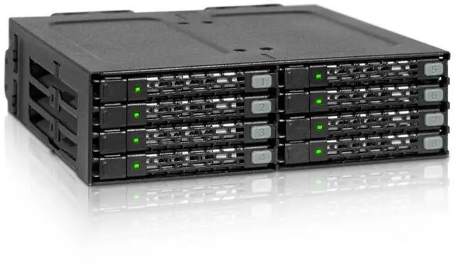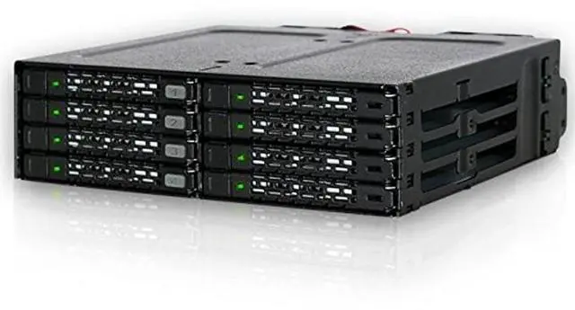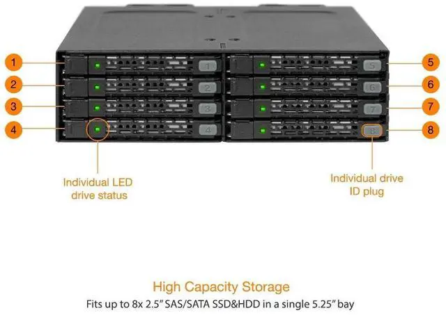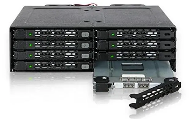 Fits 8 x 5mm to 7mm 2.5 SATA hard drives or SSDs in a single external 5.25 bay for high performance RAID applications ^^ Connected by 2x Mini-SAS HD data cables for all 8 bays, for plug-and-play compatibility with most motherboards and RAID cards ^^ Requires only 2 x 15pin SATA power connectors to power all 8 bays (drives) ^^ Dual 40mm user-controllable fans, with settings for high, low, and off ^^ Rugged Heavy duty full metal construction with commercially designed for medical &military systems, media servers, workstation, HPCs and IPCs, approved & used by Tier 1 companies