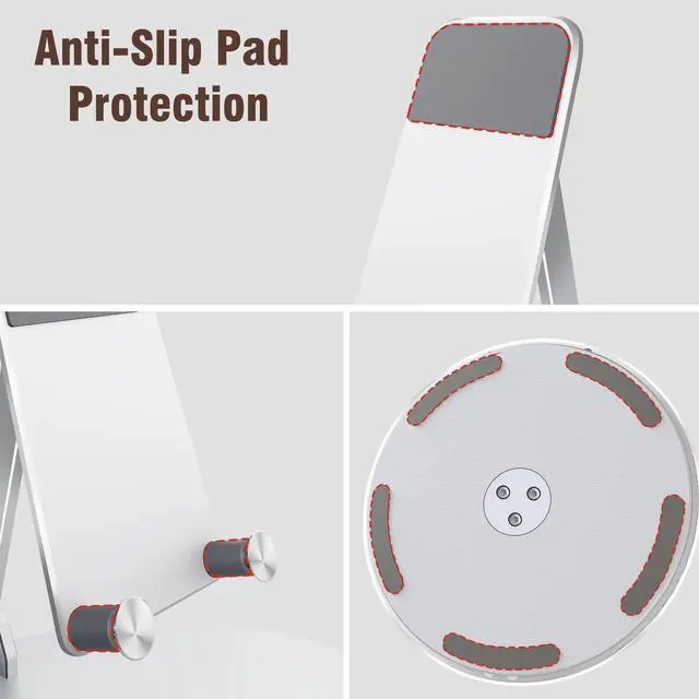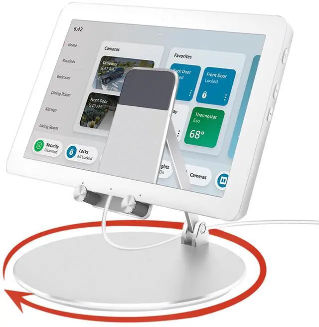 [Widely Versatile] - The adjsuatble echo hub stand is compatible with 8-inch Echo Hub as well as 4 to 12.9 -inch iPads/Tablets. (Echo Hub device not included) ^^ [Stable Rotation Base] - The thickened and wide base structure offers sturdy support, ensuring the stability and safety of the alexa echo home hub during rotation. Silicone pads at the bottom prevent the device from sliding or scratching desktop surfaces. ^^ [Adjustable Viewing Angles] - The dual-axis design allows for flexible adjustment of the alexa hub stand's height and angle to cater to users' diverse angle preferences, ensuring a comfortable viewing experience.