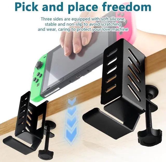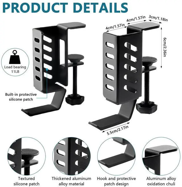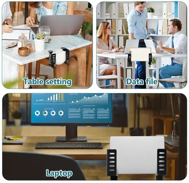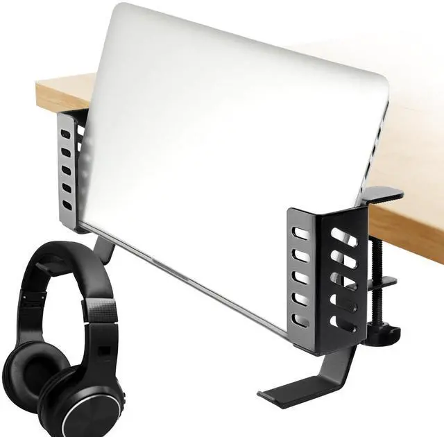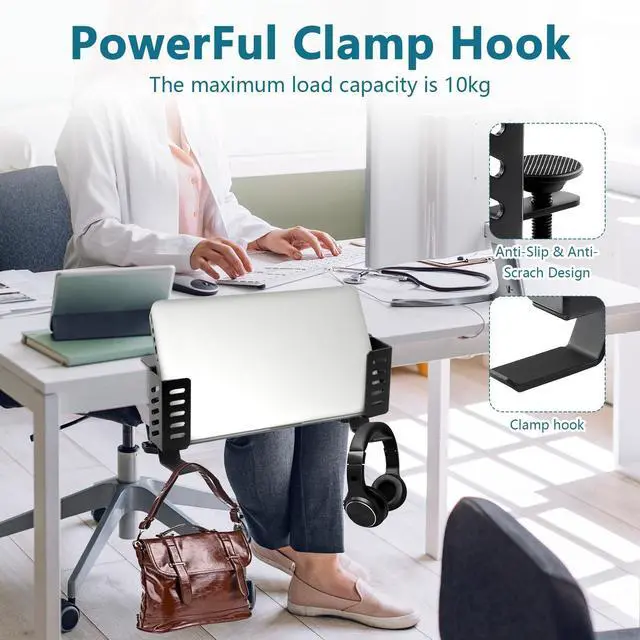 No Drill Desk Side Laptop MountEffectively Save Desktop SpaceThis desk side hanging organizer can be retrofitted to the side of a desk to easily hold a laptop, tablet, Notebooks, Keyboards, Headphone, gamepad, Backpack, and other items. Multifunctional Desk Side Storage OrganizerHigh Quality Steel MaterialNo Drilling & Easy to InstallMaximize Desktop Space