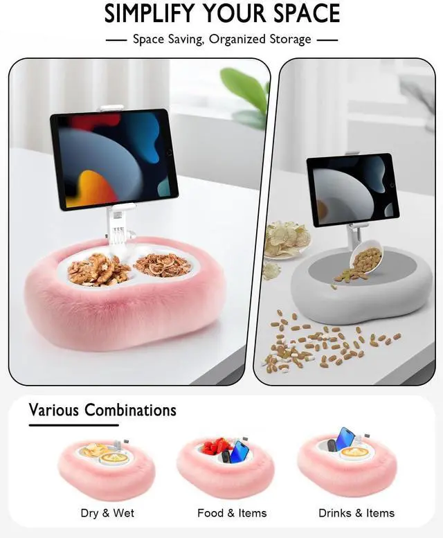 ^^ Detachable Food-Grade Bowl: This phone holder for bed included bowl features two compartments for storing snacks, drinks, your stylus, phone, or remote, made from food-grade materials and dishwasher safe for easy cleaning and convenience. ^^