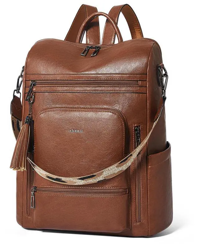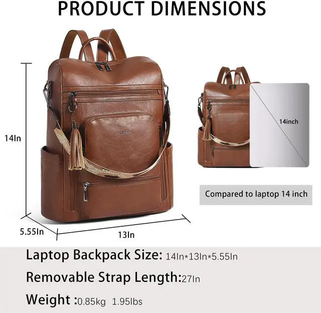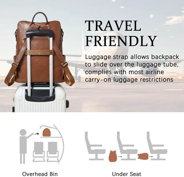 Leather Laptop Backpack for WomenMade of high quality waterproof Vegan leather, HEAVY DUTY & DURABLE. Total of 9 pockets, easy to organize all work necessities, college supplies, travel essentials. ^^ Practical Backpack Luggage Strap DesignDesigned for traveling, it helps you free your hands and back from the burden. Make your travel more convenient and enjoyable. Waterproof travel backpack fits under the seat also meets airline carry-on requirements. ^^ Large CapacityThe large capacity laptop backpack has multiple divider pockets, easy for holding laptop, ipads, Phone, binder, water bottle, umbrella, magazine, pens, wallet and so on.