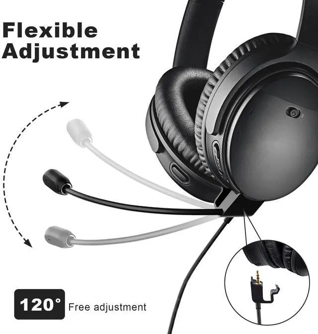 CompatibleThis is a 2-in-1 gaming and everyday boom microphone audio cable for Bose QuietComfort 45 wireless bluetooth noise cancelling headphones. Adjustable boomWith the 120 adjustable boom microphone, you can adjust it to the position you feel most comfortable with, with great styling capabilities, so it won't wobble around, even when there's too much movement in the game. Mute SwitchSlide the mute switch up and down to control the microphone's voice transmission or not, easy in-line adjustment. High-quality materialsBoom mic cable made of high quality TPE material, flexible, soft, durable, anti-tangle design.
