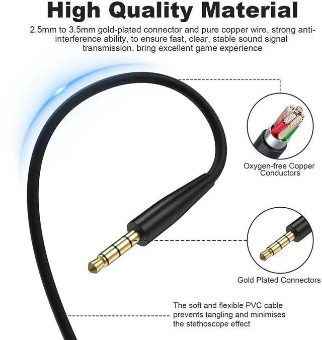 2.5 mm to 3.5 mm gold-plated connectors are anti-oxidation and anti-corrosion, ensuring a solid and high-quality connection between the connected devices. Noise-resistant microphoneCable boom microphone with acoustic noise cancellation technology, good noise reduction, clear sound, high sensitivity, more flexible, better sound pickup, ensure you maintain stable communication during games or calls. 2.5 mm jackCompatible with Bose QuietComfort 45 headphones. 3.5 mm jackConnects to Mac, Windows PC, PS4, PS5, Xbox One controllers, iPhone, Android phones and more.