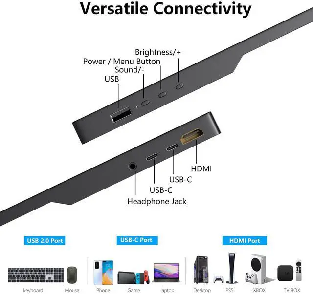 ^^ Wide Compatibility: The portable external USB C portable monitor has dual USB-C, HDMI, and a dedicated USB-A port. You can connect it to a variety of devices, including laptops, desktops, gaming consoles, and mobile phones. It's truly plug-and-play, supporting extended, mirrored, and second monitor modes right out of the box. ^^ Portable & Ultra-Slim