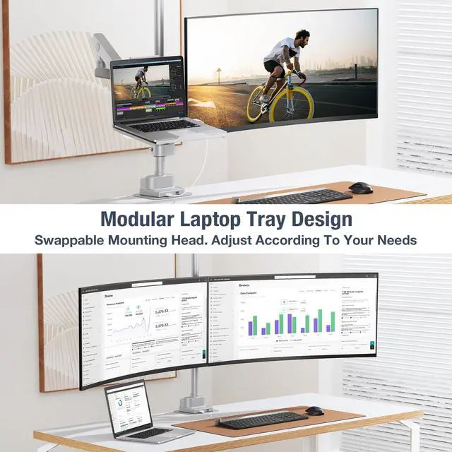 Support laptop + dual 40" ultrawide monitors up to 26.4 lbs (12 kg) each with ergonomic stacking arms, USB-C/A ports, cable management, and space-saving top mount for a sleek, productive workspace.