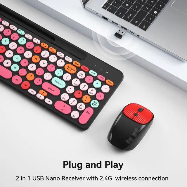 Plug & Play 2.4G Wireless ConnectionOne 2.4 GHz USB receiver can connect both the keyboard and mouse, can also be used separately, plug & play, no need to download any software. 2.4 GHz wireless provides a powerful and reliable connection up to 33 feet (10m) without any delays. (Wireless USB receiver is at the bottom of the mouse). No Delay, No Dropout. ^^ Power Saving Extends Battery LifeAfter 10 minutes of inactivity, the wireless keyboard mouse combo will automatically go into sleep mode to save energy. The keyboard requires two AAA battery, and the mouse requires one AA.