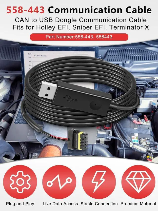 The 558-443 USB Communication Cable is a precision-engineered solution for Holley EFI systems, including Sniper EFI, Terminator X, HP EFI, and Dominator ECU platforms. Designed for seamless CAN-to-USB communication, this cable eliminates the need for adapters or converters, allowing you to connect directly to your laptop for diagnostics, tuning, and performance optimization. With real-time data streaming and logging, you can instantly monitor engine parameters, troubleshoot issues, and fine-tune your vehicle for maximum efficiency and power. Whether on the dyno, at the track, or during a street build, this cable provides reliable access to your ECU.