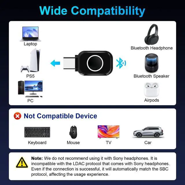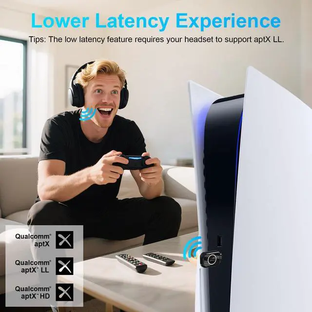 ^^ Low LatencyThis ps5 bluetooth adapter has AptX low Latency technology. When you pair it up with Bluetooth headphones that also support aptX-LL or aptX-Adaptive, theyll eliminate the annoying Bluetooth audio delay problem and provide perfectly synced audio & visual. Ideal for Playing games or listening to music. ^^ Wide CompatibilityThis Bluetooth audio adapter can easily add Bluetooth audio function to your PS5/MAC/laptop/PC and other devices through the USB-C port. Whether you're at home or in the office, you can use it.