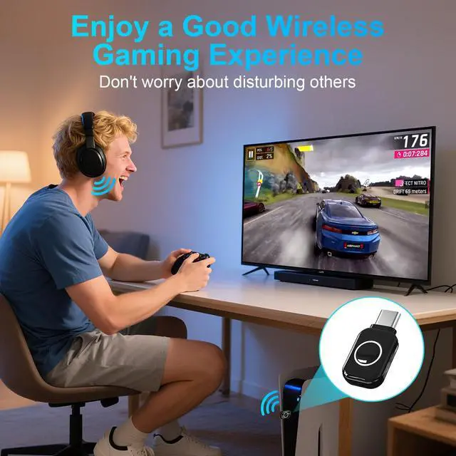 Unlimited play Our Type-C Bluetooth dongle is a Bluetooth transmitter designed for gamers looking for wireless connectivity. The adapter streams audio from your PS5 or other devices to your Bluetooth headphones so you can enjoy long late-night gaming sessions without worrying about disturbing your family or roommates. ^^ Plug and Play Don't worry about complicated steps. No drivers are required. Plug the Bluetooth adapter into your PS5 or other gaming consoles, pair it with your Bluetooth headphones, and play away! After the first successful pairing, the Bluetooth connection will automatically recognize and use it for follow-up.