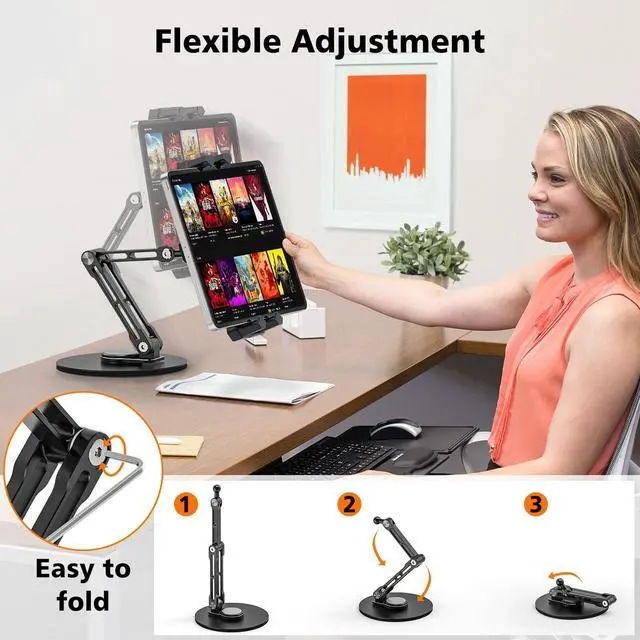 ^^ Full-Range Adjustability: The robust 2-section metal arm offers maximum flexibility. Fold, extend, tilt, and rotate your tablet 180 degrees to achieve the ideal height, depth, and orientation. Reduces neck and eye strain during extended use for work, studying, or streaming content. ^^ No Assembly is Needed and