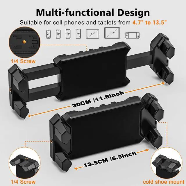 ^^ Wide Compatibility: Fits all 4.713. 5-inch phones and tablets, including: iPad Pro 12.9 / 11 / 10.5 / 9.7 inches (horizontal mounting only for larger tablets), iPad Air, iPad Mini, Galaxy View / Note Pro / Tab Pro, Galaxy Tab, Galaxy S24/23 Ultra, iPhone 16/15/14/13/12 Pro Max, and more. And silicone padding keeps devices scratch-free!