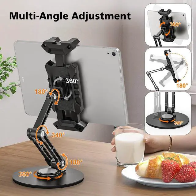 Rotation: Enjoy one-handed convenience with the smooth 360 rotating heavy-duty round base. 360-degree roatation and 180-degree titl ball head can easily spin your tablet to the perfect viewing angle, glare-reducing viewing angle for following recipes, watching videos while lying on the couch/bed, working (second screen, video calls, typing) adn studying. ^^