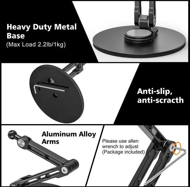 Stable & Heavy-Duty Construction: Features a weighted metal base with non-slip rubber pads providing exceptional stability to firmly attached to a desktop, counter, or any smooth surface. Securely holds larger 13.5 -inch tablets without wobbling or tipping, even during frequent adjustments or touchscreen use.