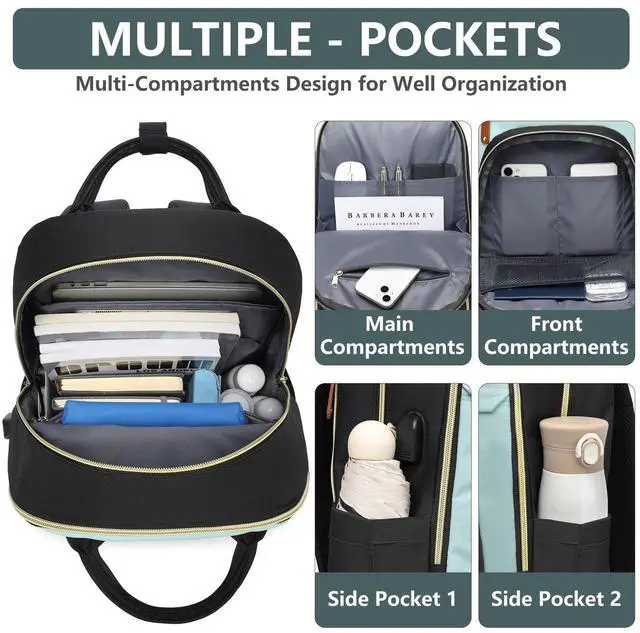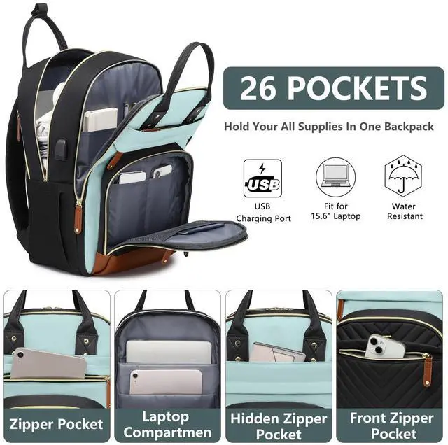Large Capacity Backpack with Laptop Compartment- This laptop backpack features 4 compartments 26 pockets totally. The laptop compartment fit for 15.6 inch computer/chromebook. The main compartment holds A4 folders, binders, work documents, clothes and other daily necessities. 3 front pockets for small items such as iPad, cell phones, chargers, keys, pens, wallets, etc. 2 sides pockets can hold a 32oz water bottle and umbrella easily and more for a 3 day weekend ^^ Convenient Luggage Strap & Anti-theft Design- The luggage strap on back of women bookbag allows it to fit on suitcase handle, freeing your hands on a business trip.
