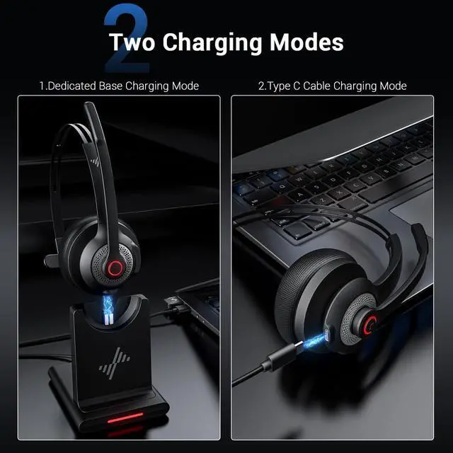 Adjustable Headset]: This computer headset with microphone has two charging modes: 1. Dedicated Base Charging Mode 2. Type C Cable Charging Mode. The headband of the wireless earphones can be adjusted and stretched to fit your head perfectly, suitable for both children and adults. The mute button can only be used on a cell phone; incoming calls cannot be answered or rejected on a computer.